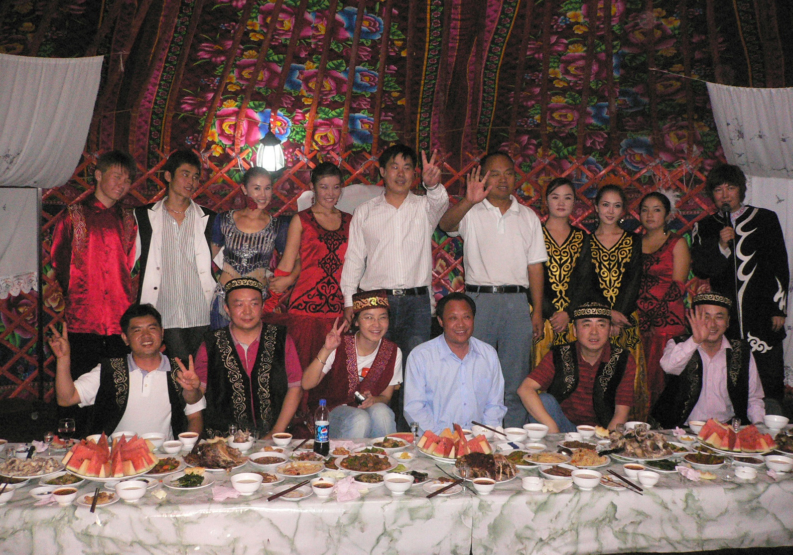 ■于青山(右三)按當(dāng)?shù)孛袼自O(shè)宴歡迎陳正華(右二)一行